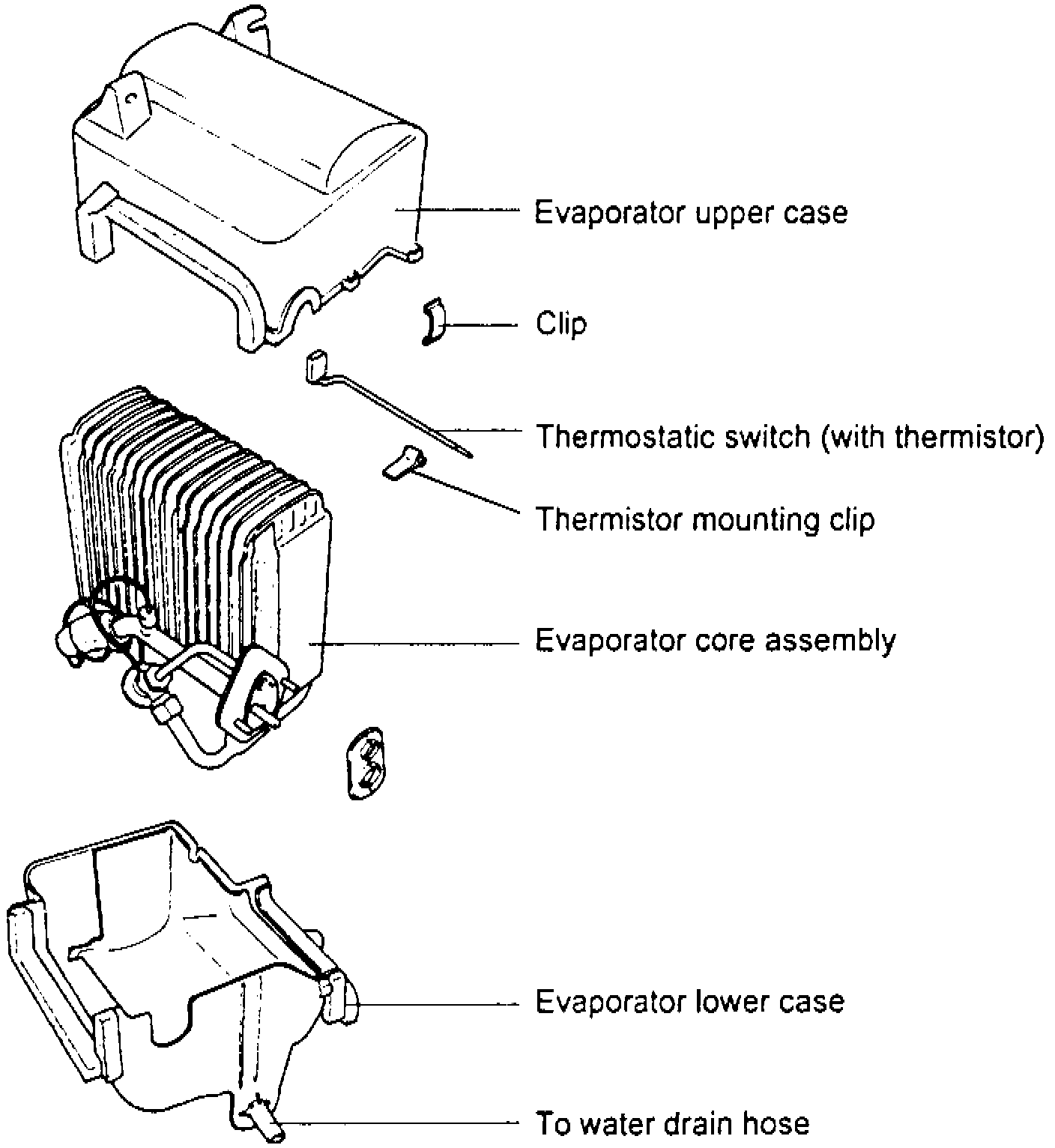 8. Remove thermostatic switch with thermistor and its mounting clip from evaporator unit.