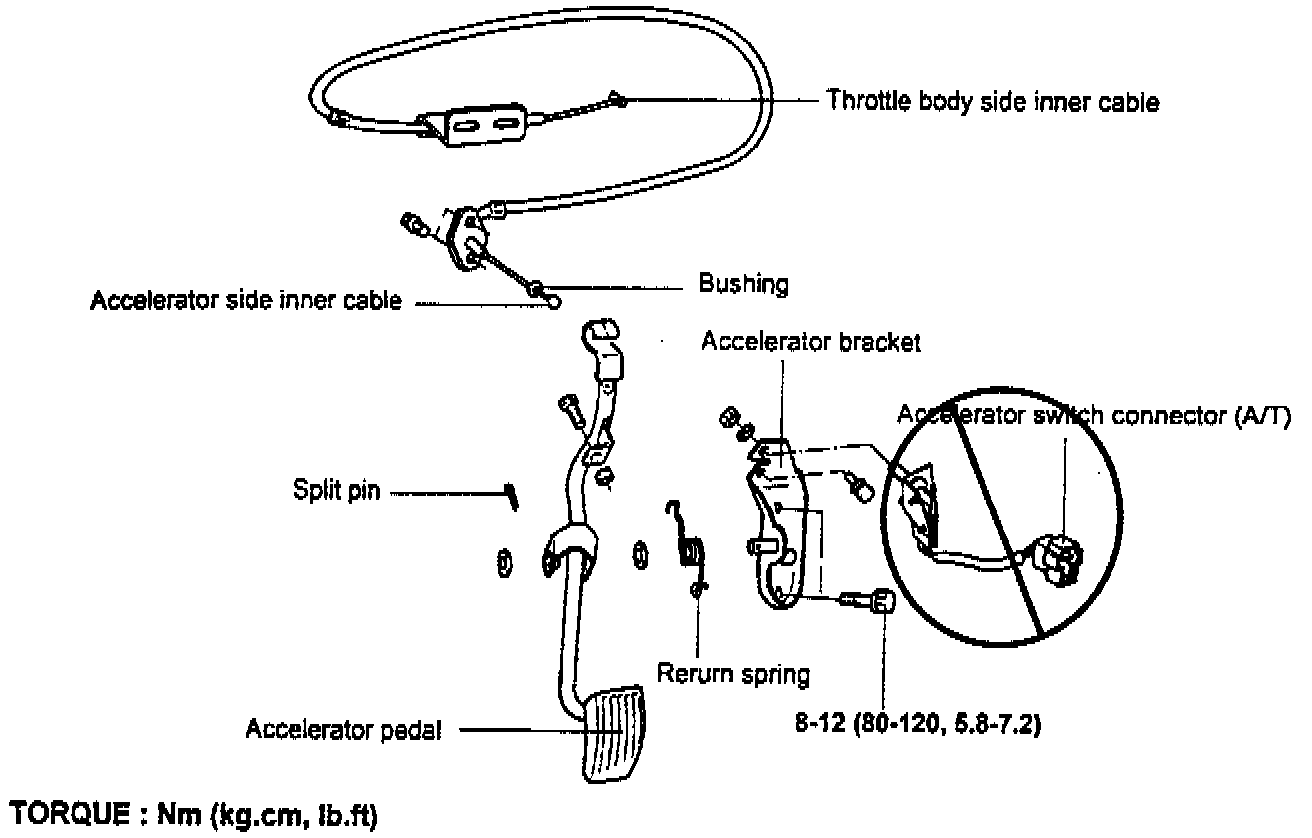 The 1995/1996 Accent shop manuals incorrectly include an accelerator switch as part of the accelerator pedal assembly. The diagrams on pages 31-96 (1995 manual) and FL-97 (1996 manual) should not include an accelerator switch and connector. When referring to these illustrations, disregard the accelerator switch reference. See illustration.