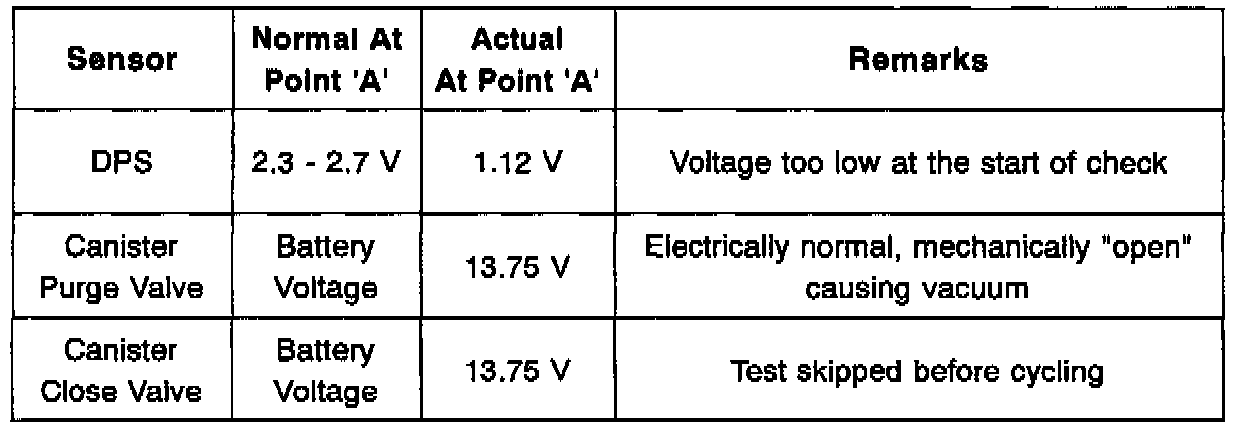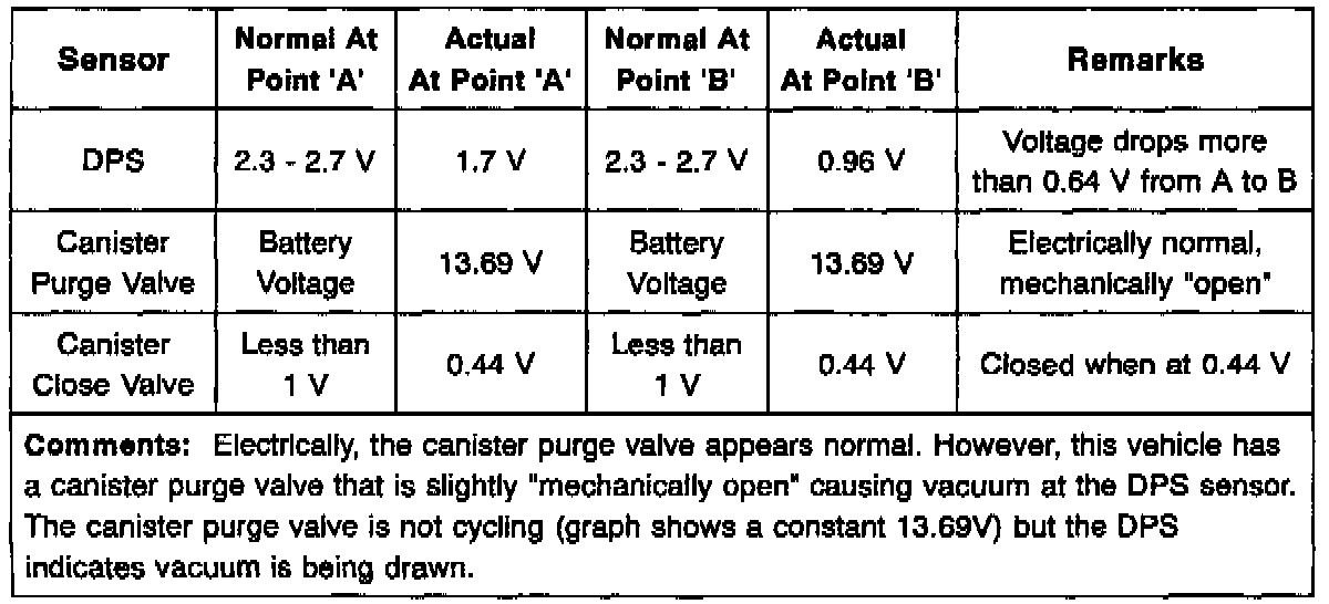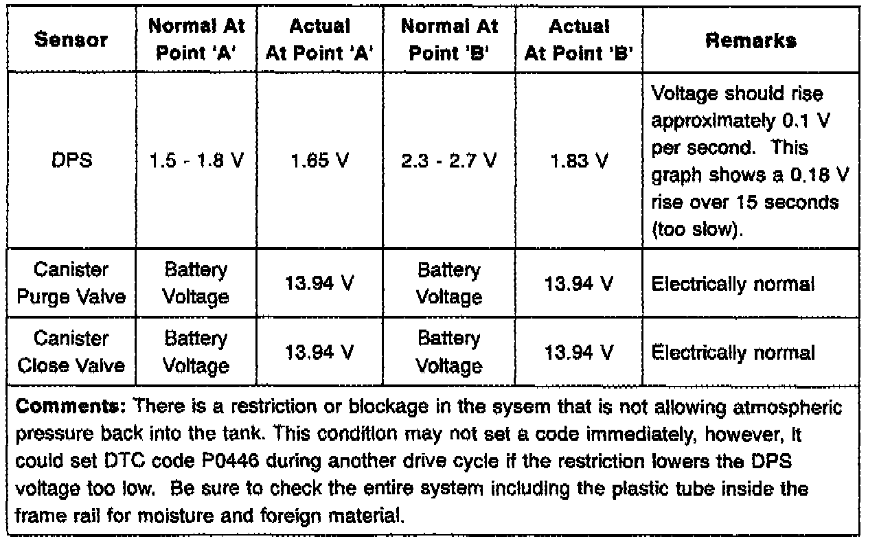 ^ Canister Purge Valve Check (P0441) - The canister close valve closes for 4.5 seconds (grounded near zero volts) and the canister purge valve is closed (at battery voltage). In a normal system, the DPS shows a small rise in pressure from fuel vaporization of approximately 0.02 volts.