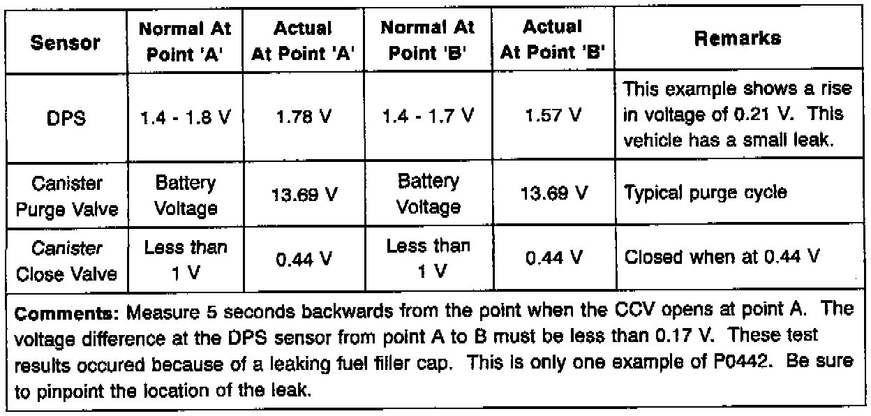 ^ Small Leak Check (P0442) - The system checks for small leaks for a period of five seconds after the DPS has reached its lowest voltage (maximum vacuum). The canister close valve is closed, and the canister purge valve is closed. In a normal system, the DPS voltage does not rise more than 0.17 volts during the five seconds before the canister close valve opens.