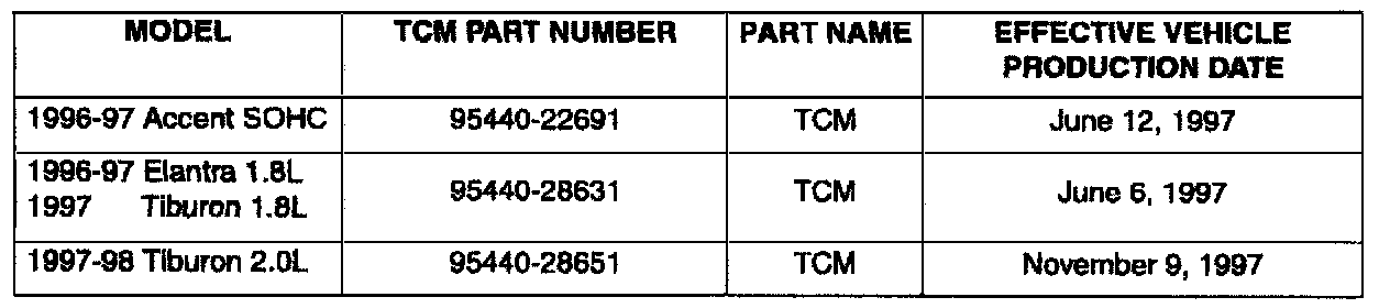 Some Accent, Elantra and Tiburon vehicles may exhibit a slight shift flare during the upshift from 2nd to 3rd gear (engine speed increases slightly during the 2-3 shift). This condition occurs at small throttle angles (15-20% TPS) when the automatic transaxle fluid is cold (below 60°C, 140°F).