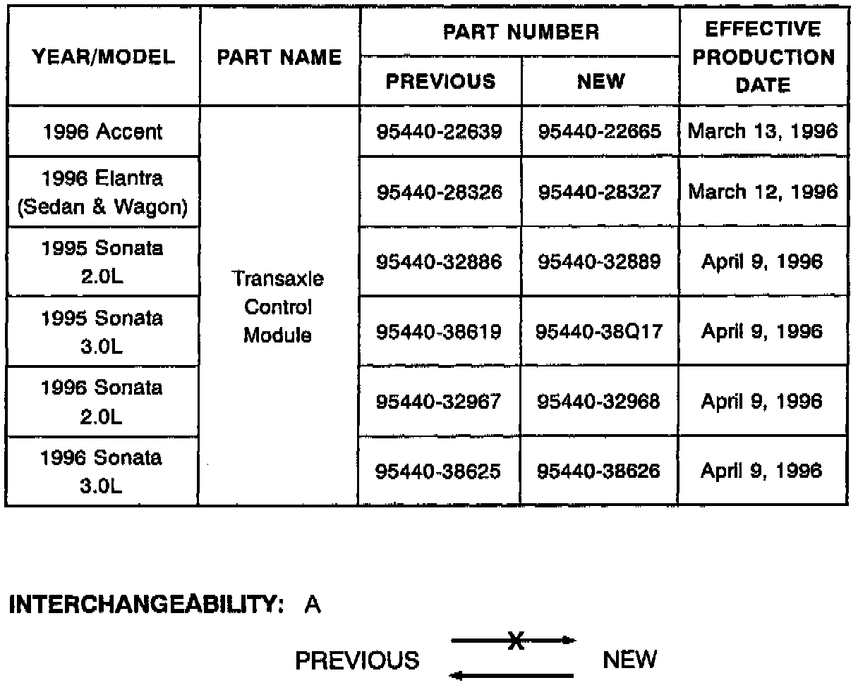 An updated Transaxle Control Module (TCM) has been designed to improve automatic transaxle shift quality and is applicable to some 1995 and all 1996 model Hyundais (see parts table for application). The new logic is designed to reduce the engagement time during the Park/Reverse or Park/Drive (also Neutral/Reverse, Neutral/Drive) commands.