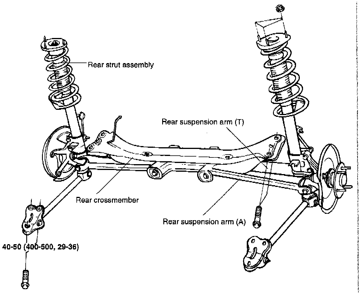 When removing rear suspension assembly, ensure front of vehicle is adequately supported to prevent tilting during removal procedure.Fig. 5 Rear Axle & Suspension:
