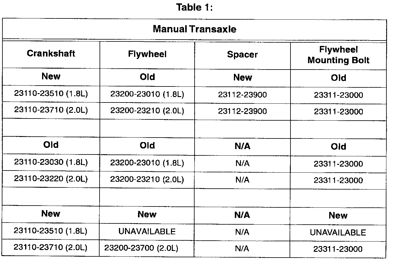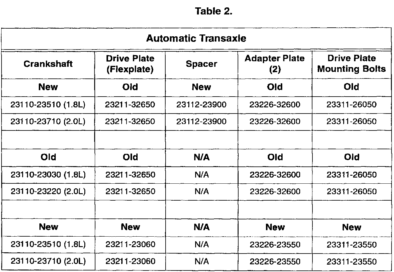 Each crankshaft and flywheel / flexplate combination necessitates that specific mounting bolts to the crankshaft are used. Tables 1 and 2 identify the different combinations for manual and automatic transaxles.