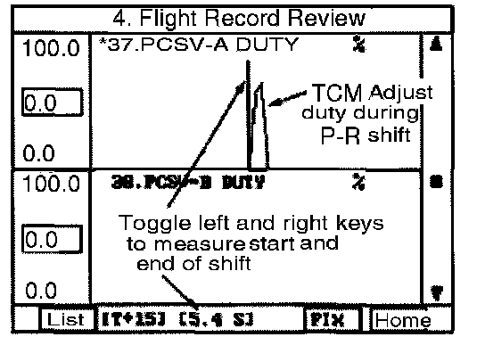 Confirm the TCM adjusts the duty during the P-R shift for the PCSV-A and PCSV-B as shown. If not, replace the TCM.