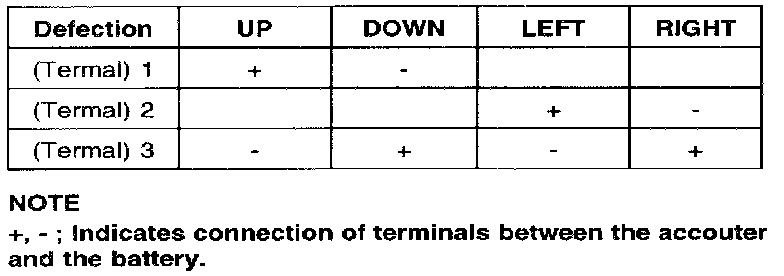 Apply battery voltage to each terminal as shown in the table, and confirm that the mirror operates properly.