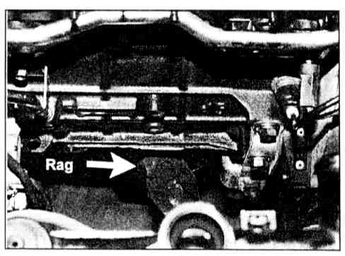 12. Place a coolant drain pan under the vehicle to prepare to catch the coolant from the engine block. Firmly place a clean rag into the exhaust pipe to keep coolant from entering the exhaust system.
