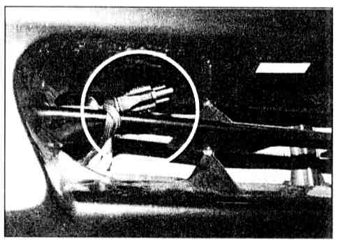 13. Remove the second from the left core plug from the engine block by using a hammer and a flat tipped punch at the "3 o'clock" position of the outer ring of the core plug. By hammering the punch at the outer flange only, the the core plug can be made to rotate in the hole, thus facilitating the removal process. Once the core plug has rotated as far as possible, use a pair of pliers to remove it.