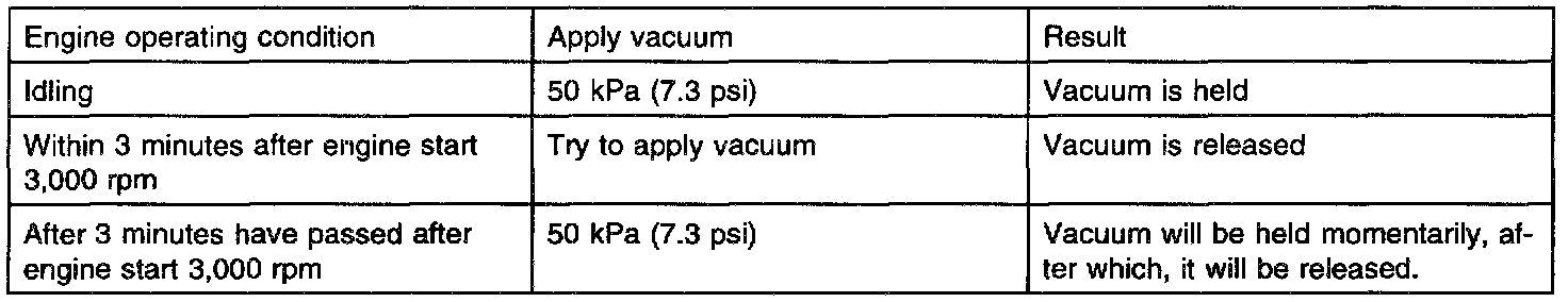 1. Disconnect the vacuum hose (red stripe) from the throttle body, and connect a vacuum pump to the vacuum hose.2. Check the following points when the engine is cold (engine coolant temperature 60°C (140°F] or below) and when it is warm (engine coolant temperature 80°C [176°F] or higher).