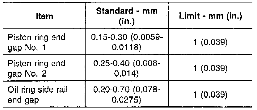 2. To measure the piston ring end gap, insert a piston ring into the cylinder bore. Position the ring at right angles to the cylinder wall by gently pressing it down with a piston. Measure the gap with a feeler gauge. If the gap exceeds the service limit, replace the piston ring.