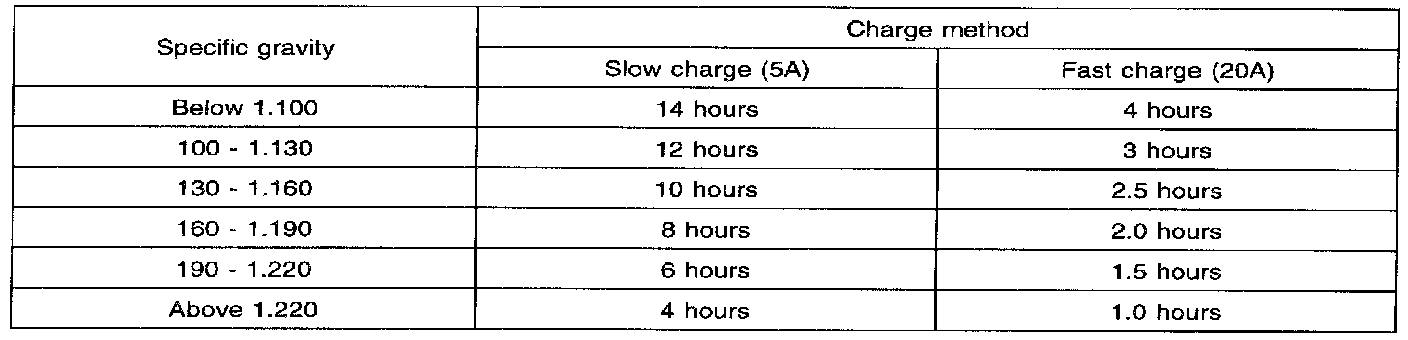 A fully charged battery should have a specific gravity between 1.260 and 1.280, with the electrolyte temperature at 80 °F. The specific gravity reading must be corrected by adding 4 points (.004) for each 10 °F above 80 °F or subtracting 4 points for every 10 °F below 80 °F.