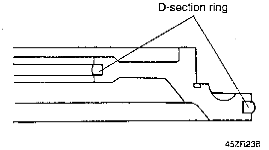1. Install the D-section rings in the grooves in the outside and inside surfaces of the piston.