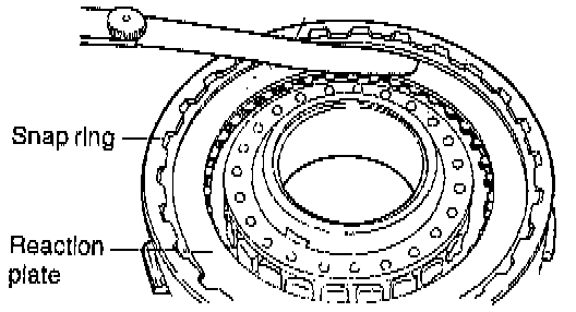 6. Install the snap ring. Check to see that the clearance between the snap ring and clutch reaction plate is, 0.4-0.6 mm (0.12-0.020 inch). To check clearance, hold the entire circumference of the clutch reaction plate down with 50 N (11 lbs.) force. If clearance is out of specification, adjust by selecting the proper snap ring. Snap rings are the same as those used for the front clutch.