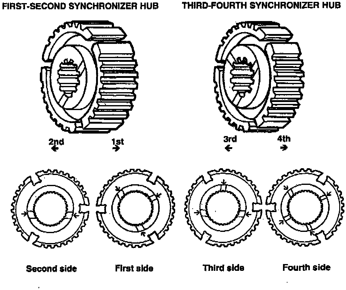 To aid in the installation of first-second and third-fourth synchronizer hubs, the hubs are now identified by the number of oil grooves. The second side synchronizer hub is identified with two (2) grooves and the fourth side synchronizer hub is identified with four (4) grooves, as shown.