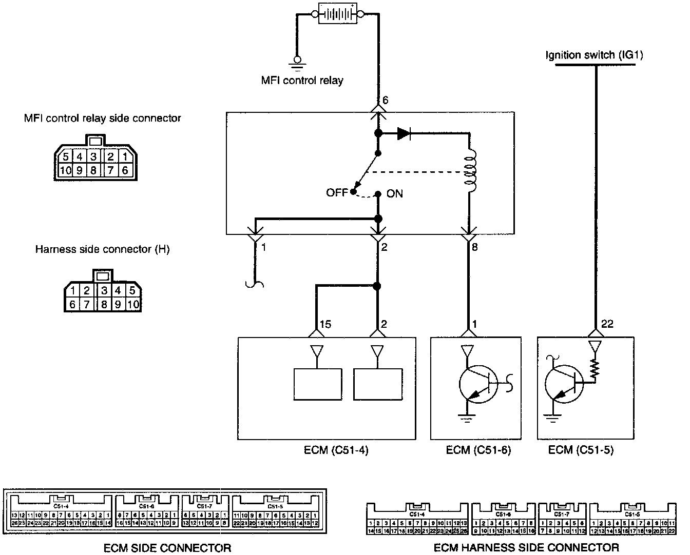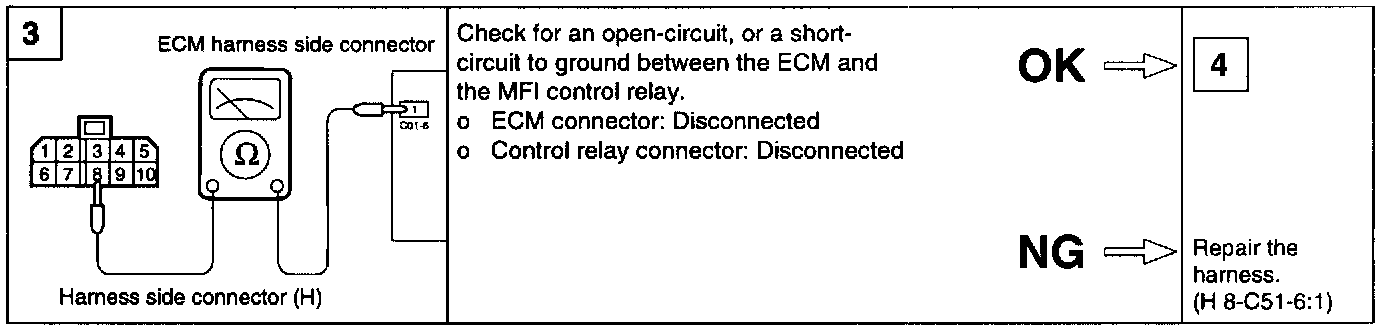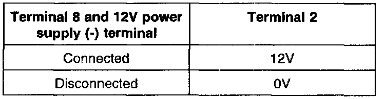 1. Connect a 12V power supply (+) terminal to the terminal 6 of the MFI control relay and measure the voltages at terminal 2 when the (-) terminal is connected to and disconnected from the terminal 8.