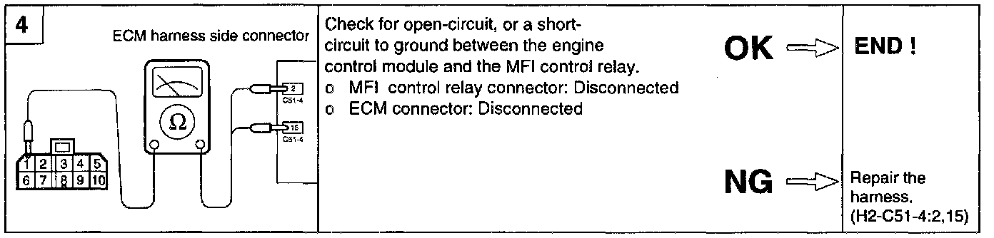 3. Connect a 12V power supply (+) terminal to the terminal 3 of the MFI control relay and measure the voltage at the terminal 4 when the (-) terminal is connected to and disconnected from the terminal 9.
