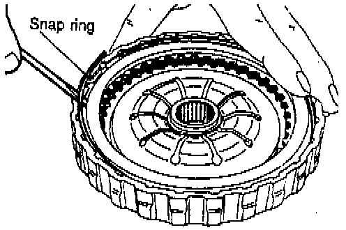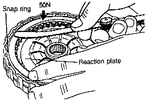 6. Install the snap ring. Check to see that the clearance between the snap ring and the clutch reaction plate is 0.6 - 0.85 mm (0.024 - 0.033 inch). To check the clearance, hold the circumference of the clutch reaction plate down with 50 N (11 lbs.) force. If the clearance is out of specification, adjust the clearance by selecting the proper snap ring.