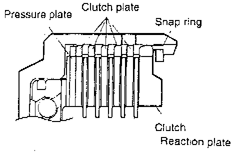 6. Install the snap ring. Check that the clearance between the snap ring and the clutch reaction plate is 1.0-1.2 mm (0.039-0.047 inch). To check the clearance, hold the circumference of the clutch reaction plate down with 50 N (11 lbs.) force. If the clearance is out of specification, adjust by selecting the proper snap ring. Snap rings are the same as to those for the front clutch.