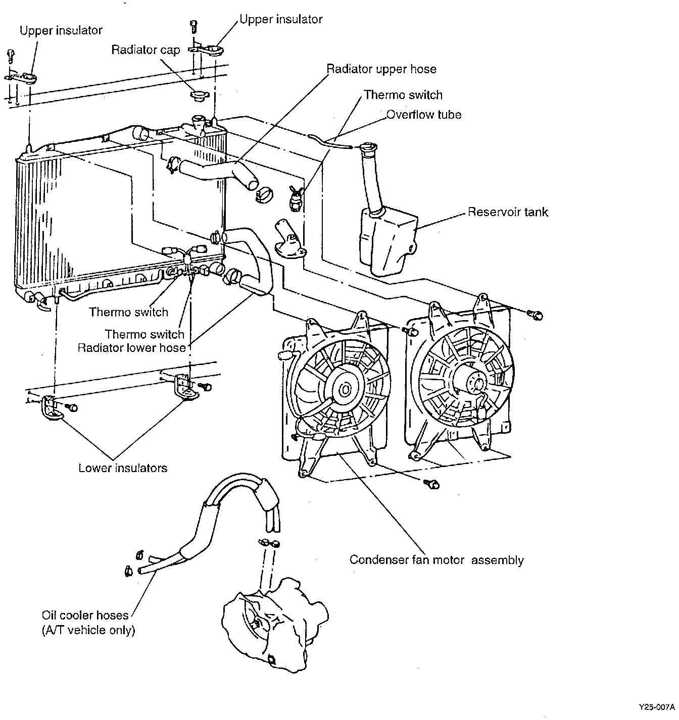 4. Disconnect the upper and lower hoses and overflow tube after making marks on the radiator hose and the hose clamp.