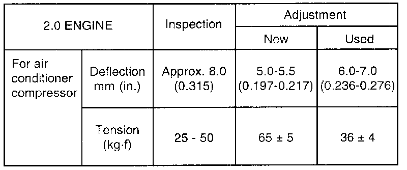 3. When adjusting a belt which has been used or a belt newly installed after 5 minutes or more of operation, refer to the standard value indicated under "Used".