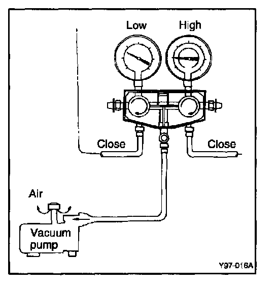 6. After about ten minutes, check that the low pressure gauge reads more than 94.39 kPa (0.96 kg/Sq.cm, 13.7 psi) vacuum. If negative pressure can not be obtained, there is a leak in the system. In this case, repair the leak as described in the following.