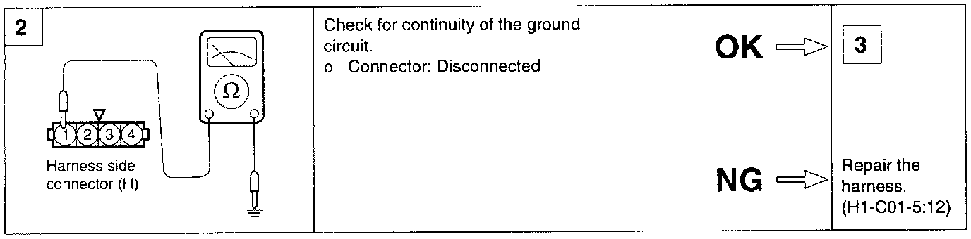 3. Connect a pointer type ohmmeter between terminal 1 (sensor ground) and terminal 3 (sensor output).