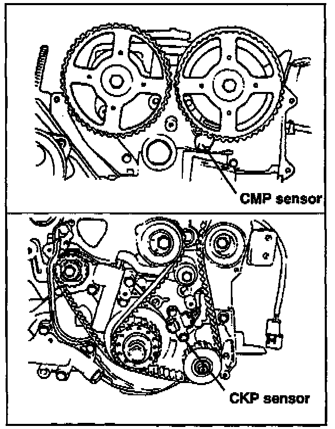 The location of the Crankshaft Position Sensor (CKP) and Camshaft Position Sensor (CMP) on the 2.0L DOHC engine are not clearly shown in the 1996-97 Sonata Shop Manuals.
