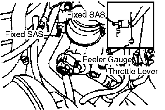 4. Place a 0.025 in (0.65 mm) thick feeler gauge between the fixed Speed Adjusting Screw (SAS) and throttle lever.