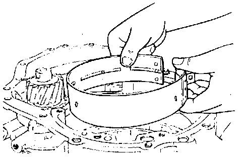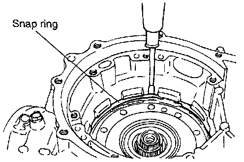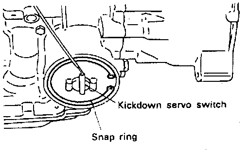 29. Using special tools (09222 - 28000, 09222 - 28100, 09456 - 21100) or equivalents, push in the kickdown servo and remove the snap ring.