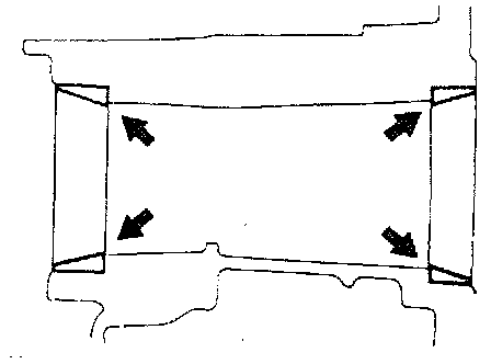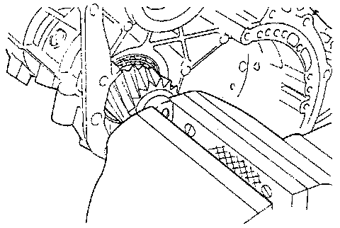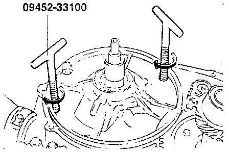 19. Remove six oil pump mounting bolts. Screw special tool (09452 - 33100) or equivalent, into two oil pump removing holes in oil pump housing. Turn both removers simultaneously and uniformly to remove oil pump assembly. Oil pump may sometimes tilt to A side, because straight line connecting oil pump removing holes does not pass center of pump. If this is the case, tap oil pump lightly on B side or tilt removers to B side as pump is removed.