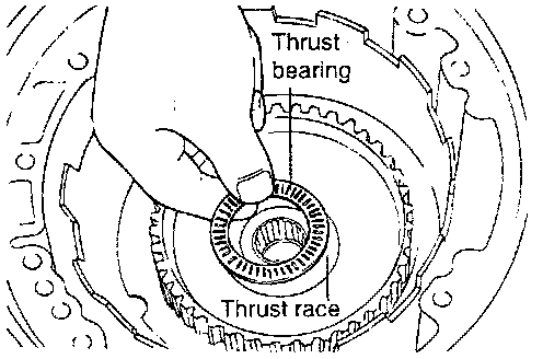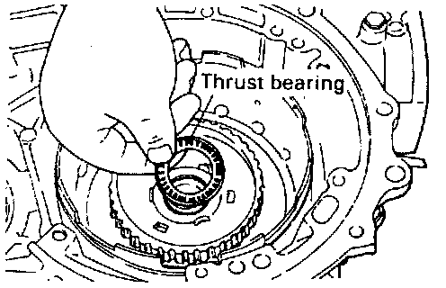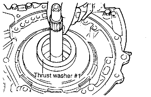 4. Measuring input shaft end play before disassembly will usually indicate when a thrust washer change is required (except when major parts are replaced). Thrust washers are located between reaction shaft support and rear clutch retainer, and between reaction shaft support and rear clutch retainer. Mount a dial indicator to converter housing with the Dial indicator Support. Make sure that the indicator plunger is seated against end of input shaft. When checking end play, pull out or push in the input shaft with pliers. Record indicator reading for reference when reassembling the transaxle.