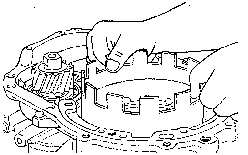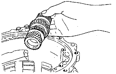 45. Remove internal gear, output flange, transfer drive gear and bearing as an assembly from case.