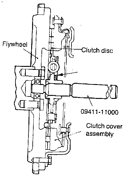 2. Insert the special tool (09411 - 11000) or equivalent, at the center spline (in order to prevent the clutch disc from falling).