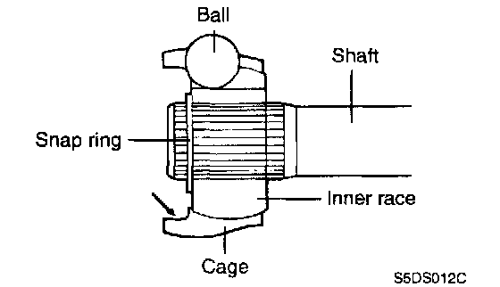 1. Remove the snap ring, then remove the Double Offset Joint (D.O.J.) inner race, the D.O.J. cage, and the balls as a unit.