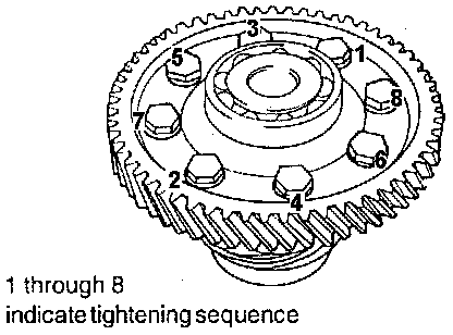 8. Apply specified sealant to the entire threads of the bolt and tighten in the order shown in figure to the specified torque with the differential case clamped in a vise.