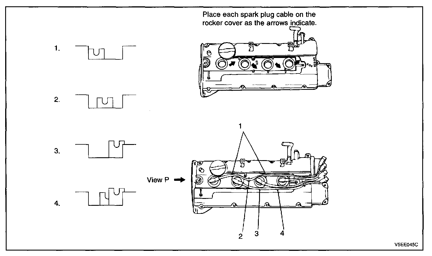 INSTALLATION OF SPARK PLUG CABLEImproper arrangement of spark plug cables will induce voltage between the cables, causing miss firing and developing a surging at acceleration in high-speed operation.