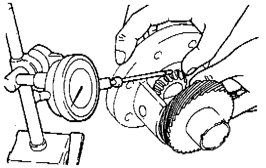 3. Measure the backlash between the side gear and the pinion gear. Backlash should be 0.025-0.150 mm (0.010-0.059 inch) and the right and left hand gear pairs should have equal backlash. If the backlash is out of specification, disassemble and reassemble using different spacers that give the correct backlash.