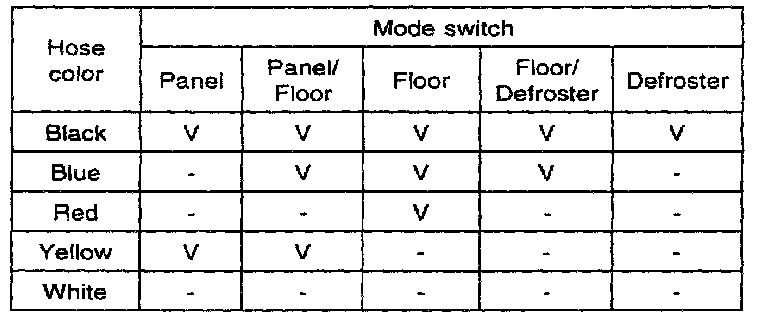 4. Check for vacuum hiss from the mode switch and vacuum hoses. and inspect for air flow between each hoses when the mode switch is at the each positions as shown.