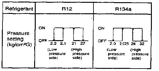 The dual pressure switch is a combination of the low pressure switch (for checking the quantity of refrigerant) and the high pressure switch (for prevention of overheating). It is installed in the receiver, and when the pressure becomes approximately 200 kPa (29 psi) or lower, the compressor stops, thus preventing the compressor from being damaged by heat When the pressure reaches approximately 3,140 kPa (455 psi) or higher, the compressor stops, thus preventing overheating. There is generally no necessity for inspection.