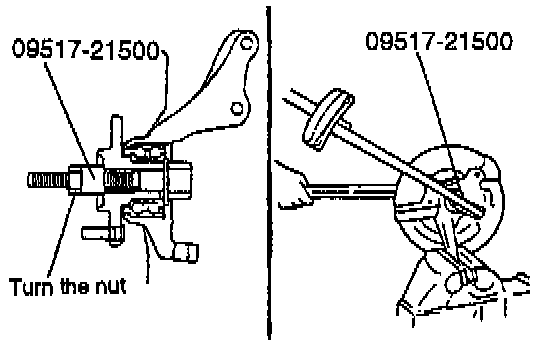 NOTE: When removing the inner race (outside) from the hub, be careful not be the hub drop.