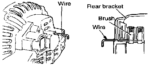 Before the rotor is attached to the rear bracket, insert a wire through the small hole in the rear bracket to lock the brushes. After the rotor has been installed, the wire can be removed.