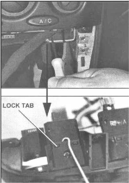 8. With a hook awl, pull the switch locking mechanism away from the switch just enough to clear the two lock tabs. Use the other hand to press the A/C switch back through the instrument panel opening.
