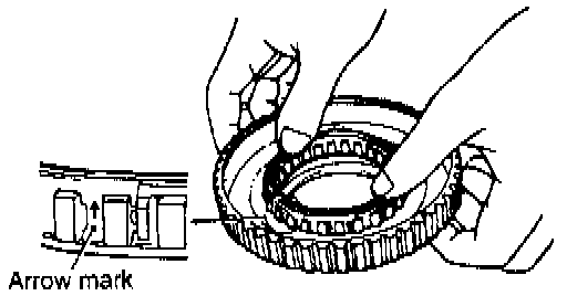 7. Press the overrunning clutch into outer race. Be sure that the arrow on the outside circumference of the cage is pointing upward as shown in the illustration when the overrunning clutch is installed.