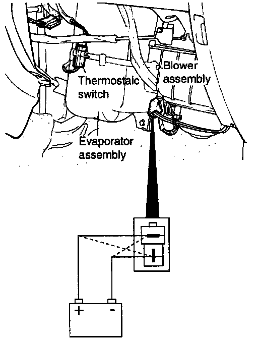 6. Connect the blower motor terminals directly to the battery and check that the blower motor operates smoothly.