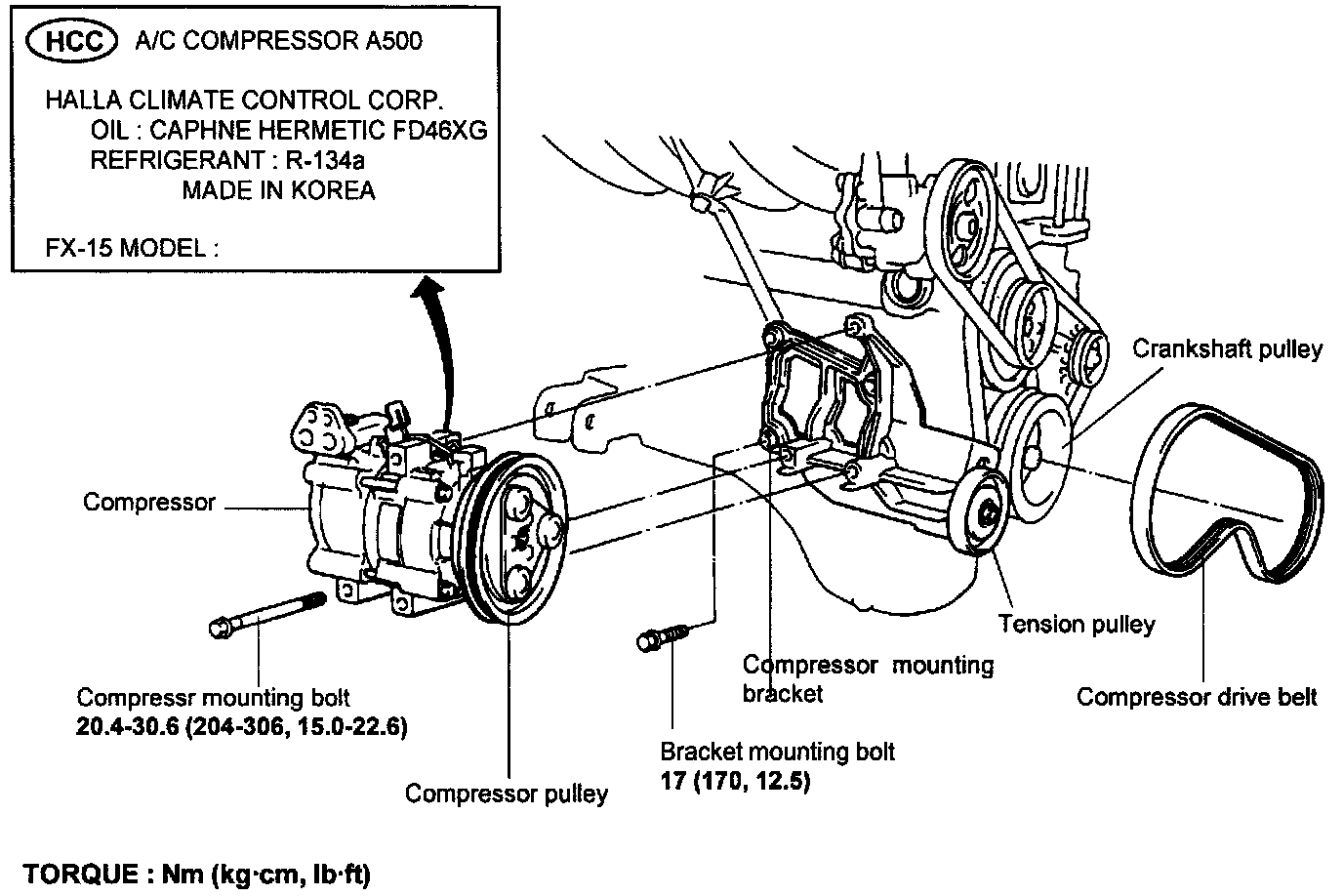 4. Loosen the tension pulley and then remove the compressor drive belt.