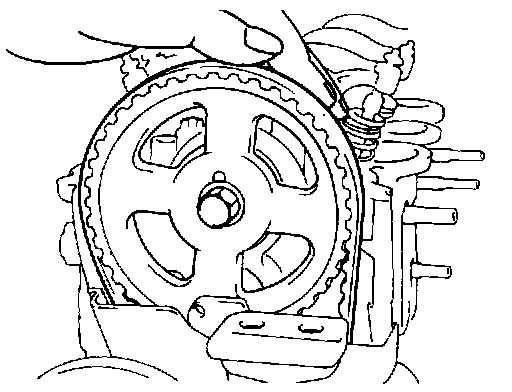 7. Install the timing belt on the camshaft sprocket. When the timing belt is installed on the camshaft sprocket, make sure that the tension side is tight. Then, check to ensure that when the tension side is tightened by turning the camshaft sprocket in a reverse direction, all timing marks are in line.