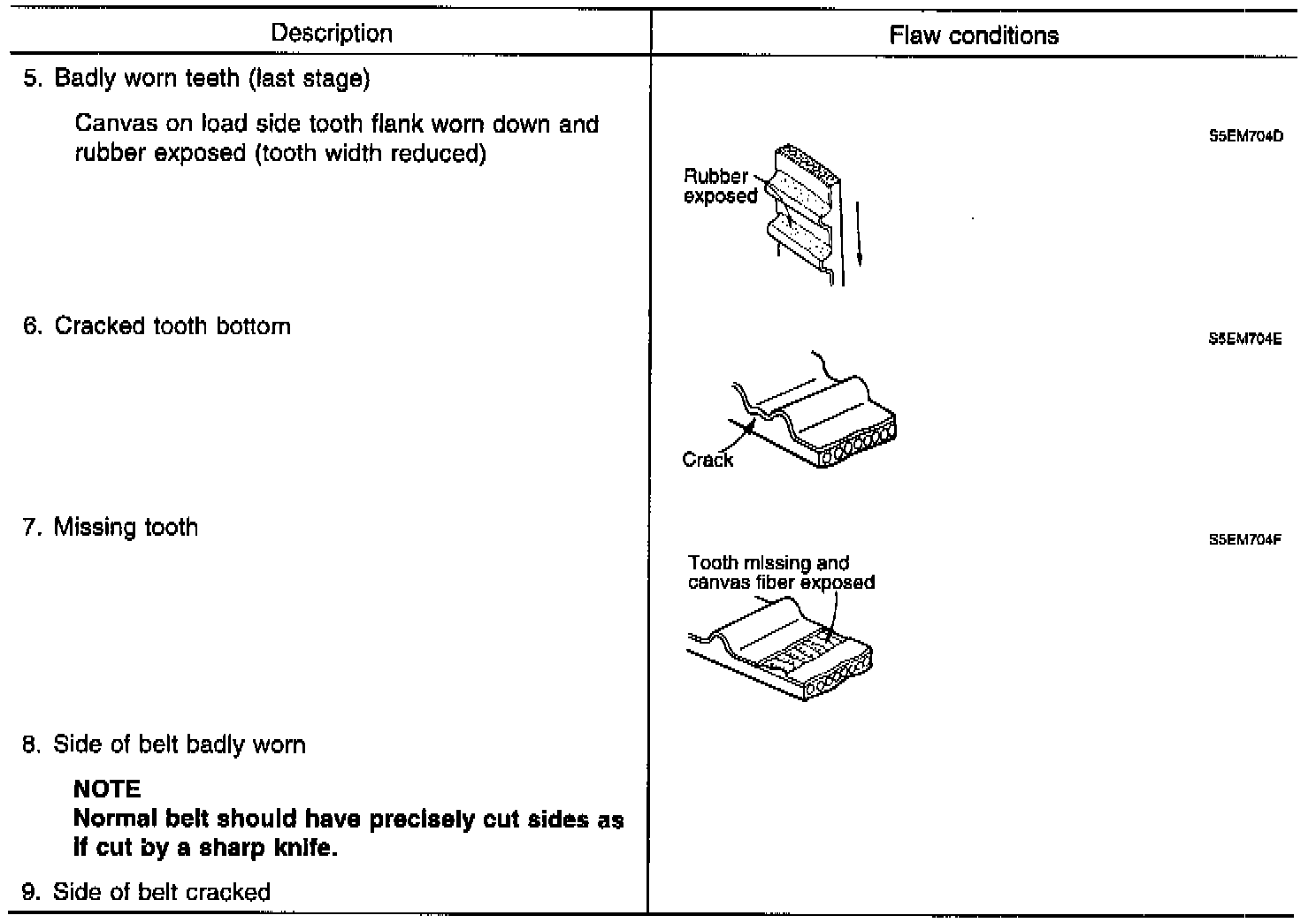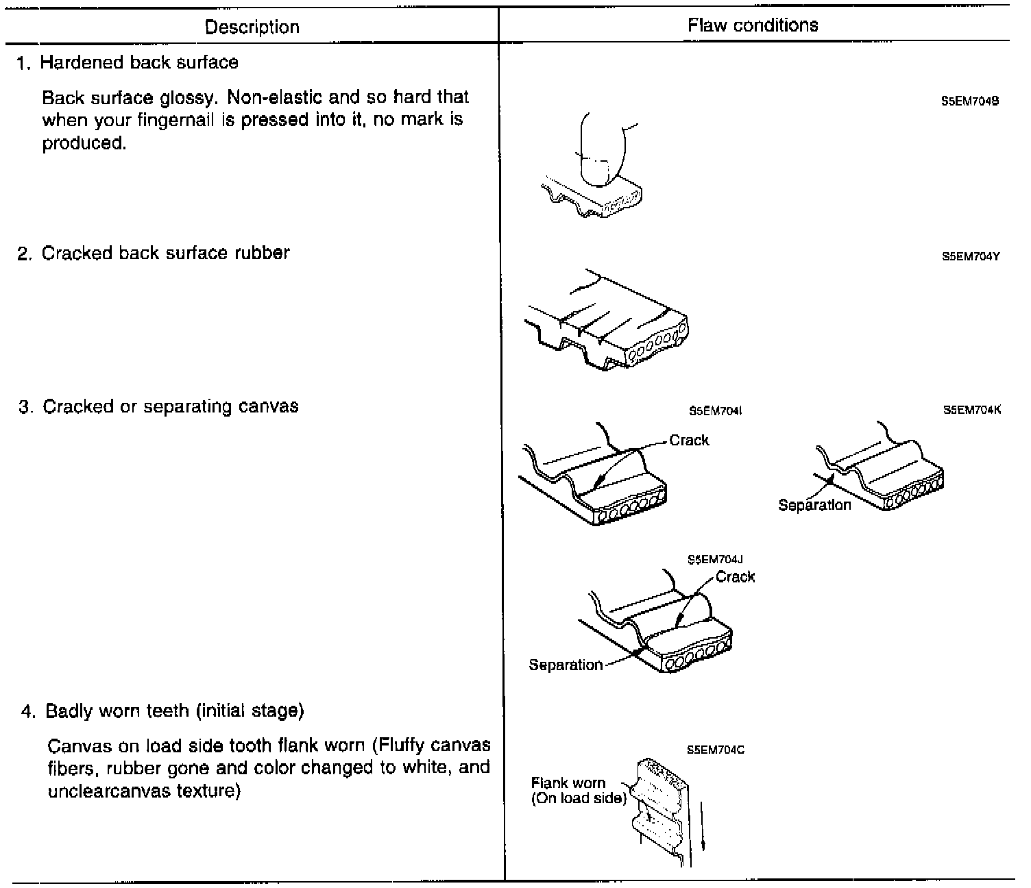 2. When the engine is overhauled or belt tension adjusted, carefully check the belt. If any of the following flaws are evident replace the belt