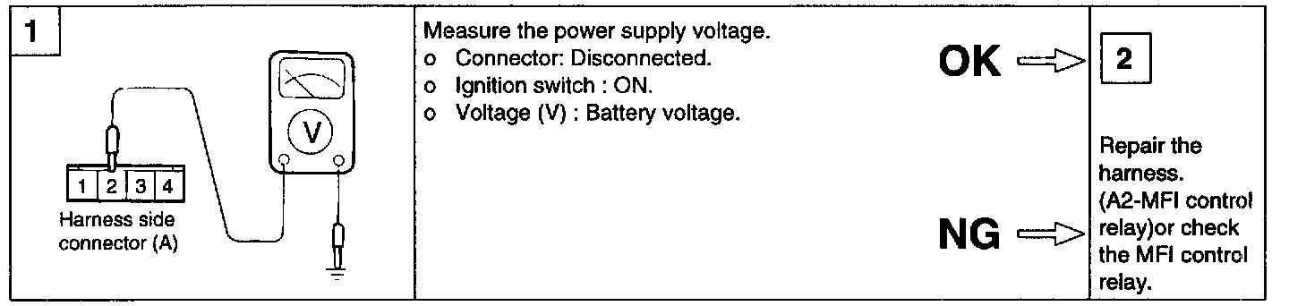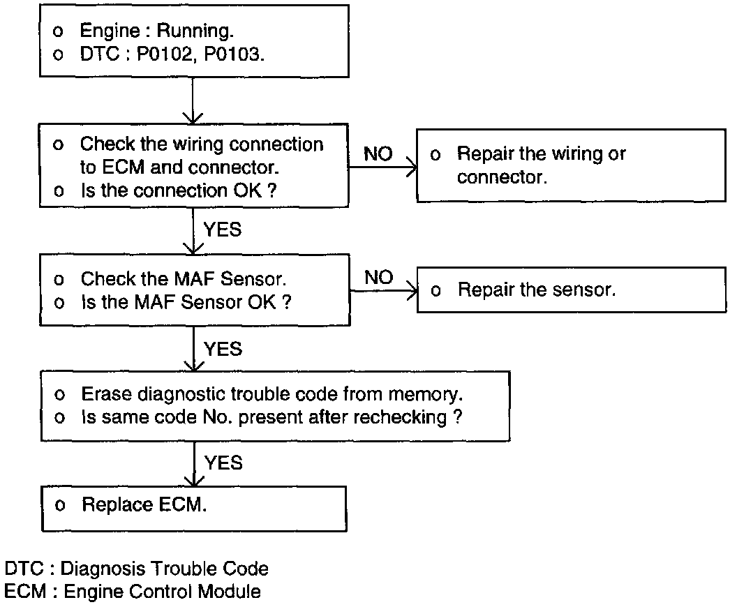 2. If the MAF sensor output voltage is other than 0 when the ignition switch is turned on (do not start the engine). Check for the faulty MAF sensor or ECM.