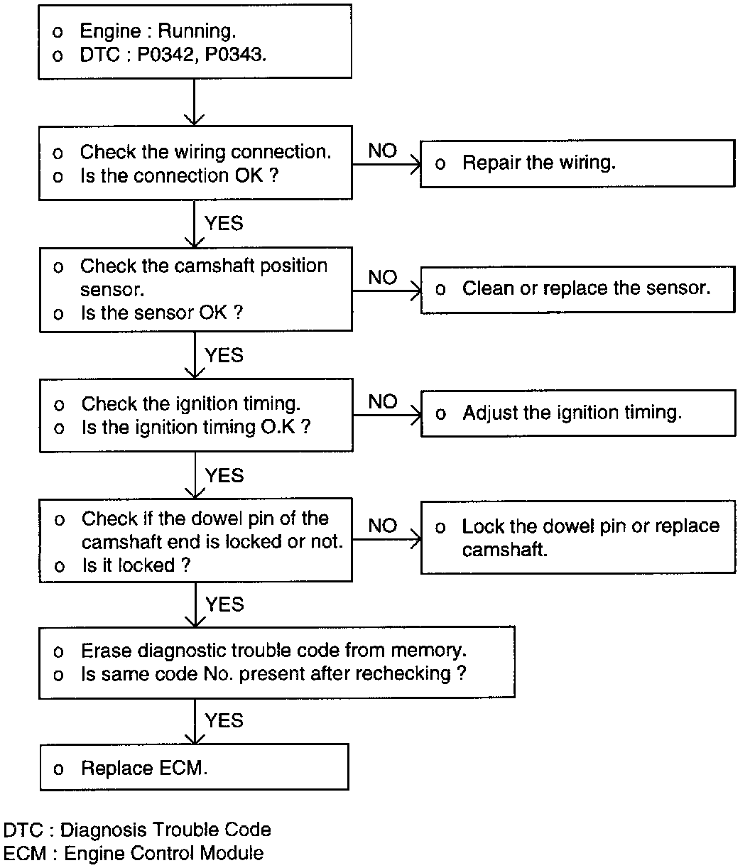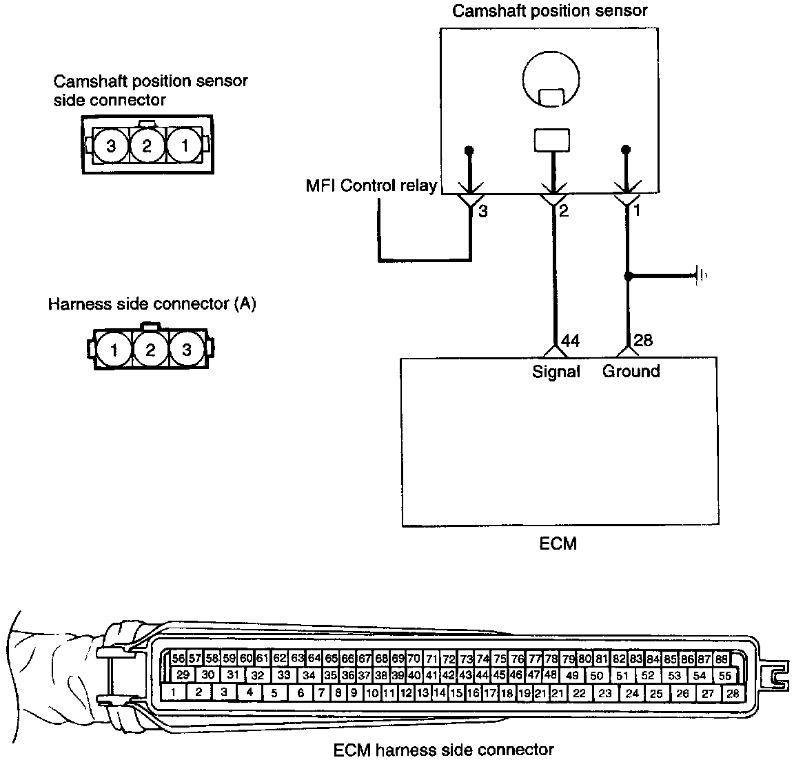 If the camshaft position sensor does not operate correctly, correct sequential injection does not occur so the engine may stall or run irregularly at idle or fail to accelerate normally.