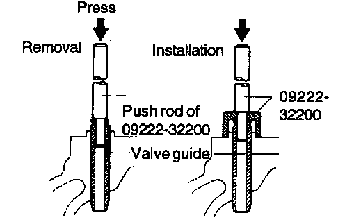 3. Using the special tool (09222-32200), press-fit the valve guide. The valve guide must be press-fit from the upper side of the cylinder head. Keep in mind that the valve guides differ in length.